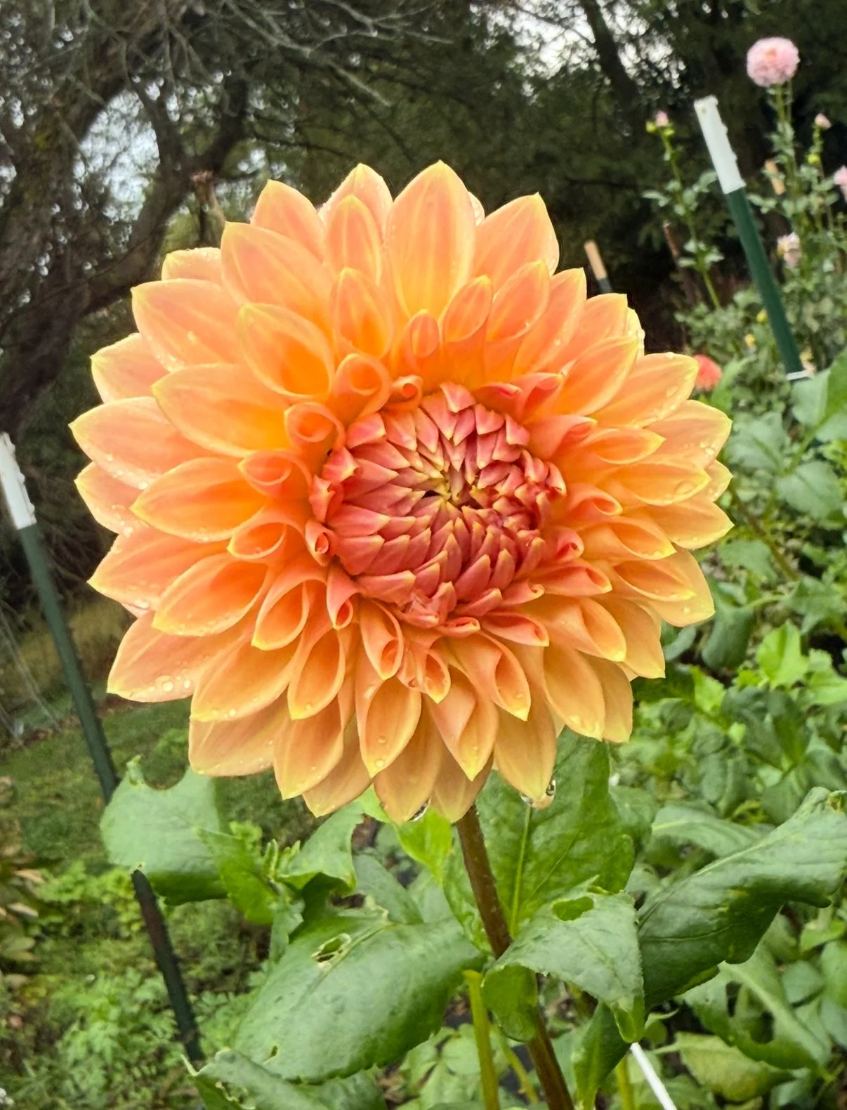 This dahlia is a tall beauty with skies that remind us of October, it’s a orangish on the outside with pink tones towards the center.