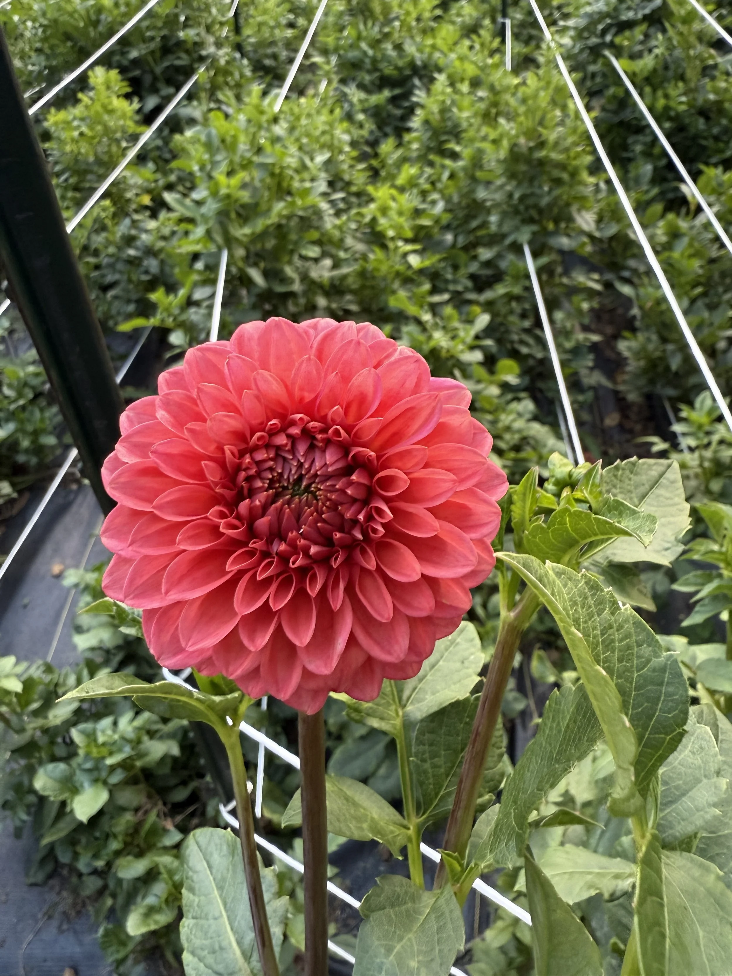 Parkland Tribute is a 4-6 inch formal decorative ball dahlia with a bright coral red bloom. It has long strong stems and is a prolific bloomer.